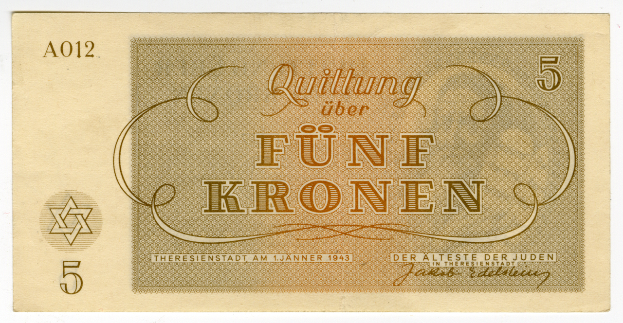 RG-06.04.07, Eva Beckman, Theresienstadt,Funf Kronen (Five Kronen). ghetto receipts | Los Angeles Museum of the Holocaust